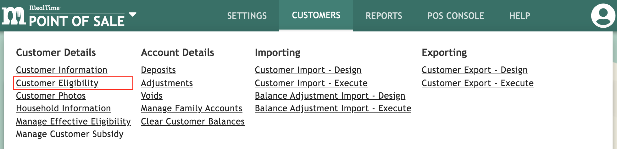 The Customer Eligibility page allows you to manually manage a customer's eligibility. The customer eligibility determinations then become visible to the kitchen manager in Point of Sale. The kitchen manager can also override the eligibility for a customer.