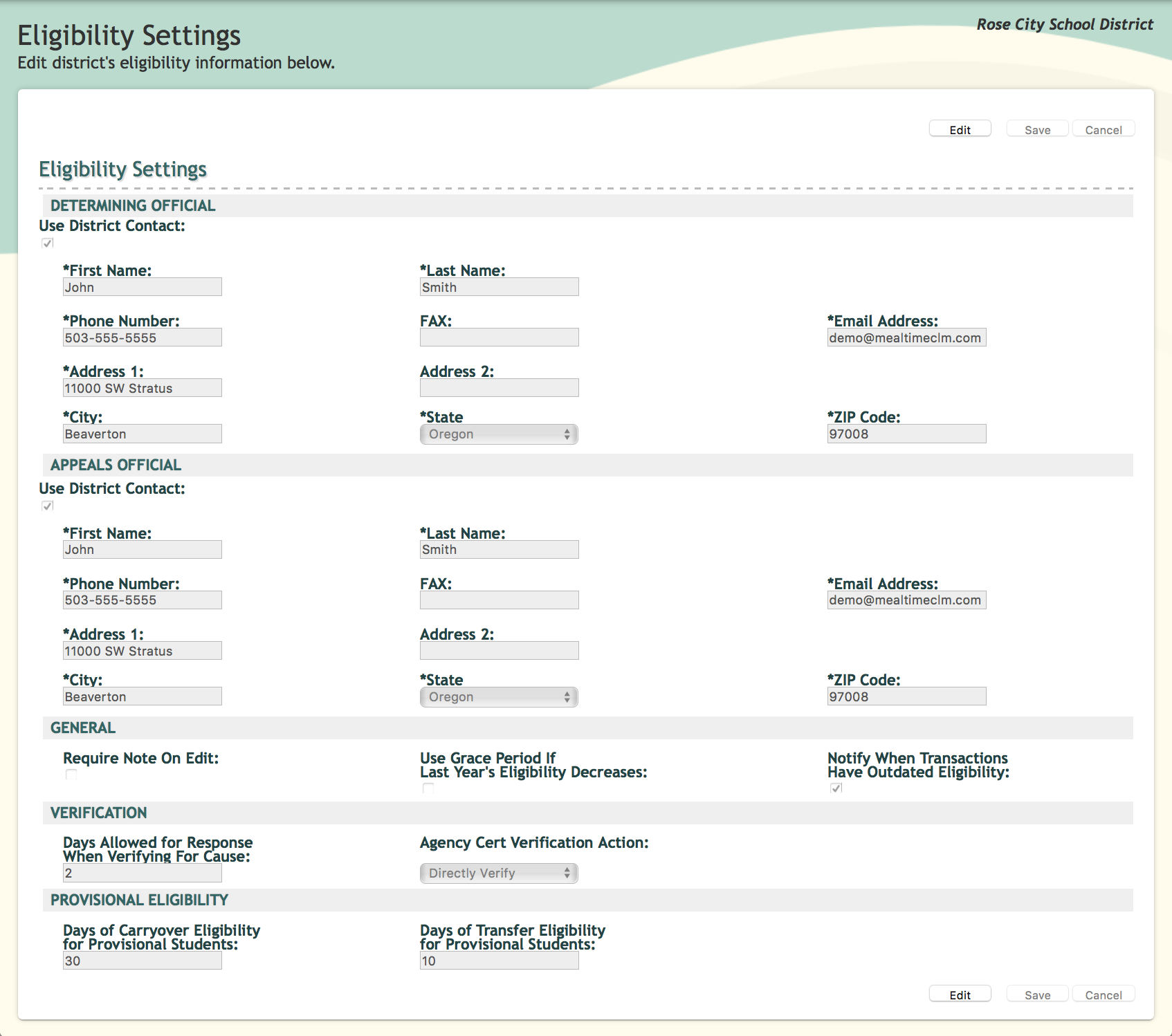 The Eligibility Settings page contains the contact information for the Determining and Appeals Officials for the district. In smaller districts, the Determining and Appeals Officials may be the same person.