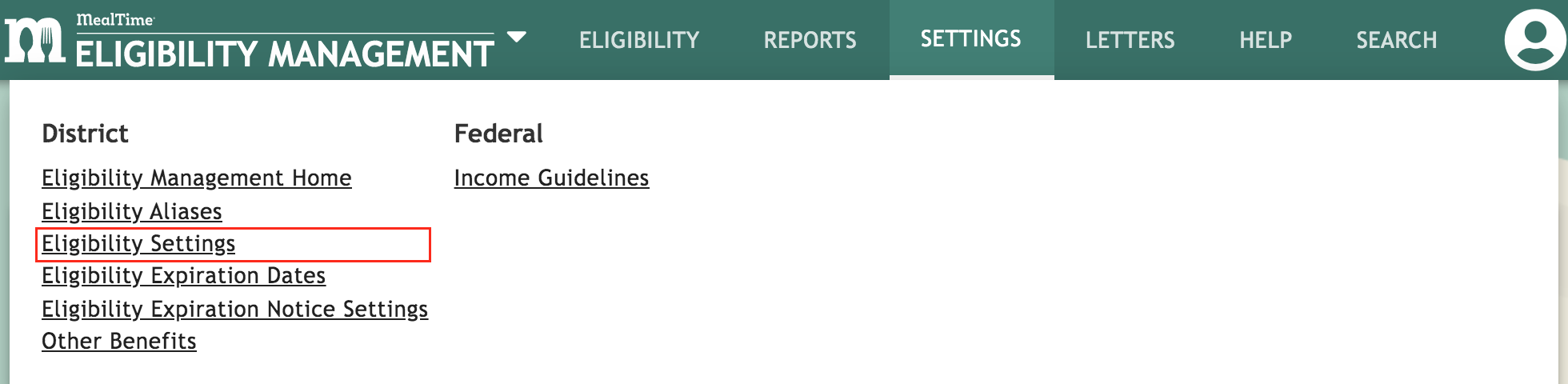 -> Go To: Eligibility Management > SETTINGS > District > Eligibility Settings