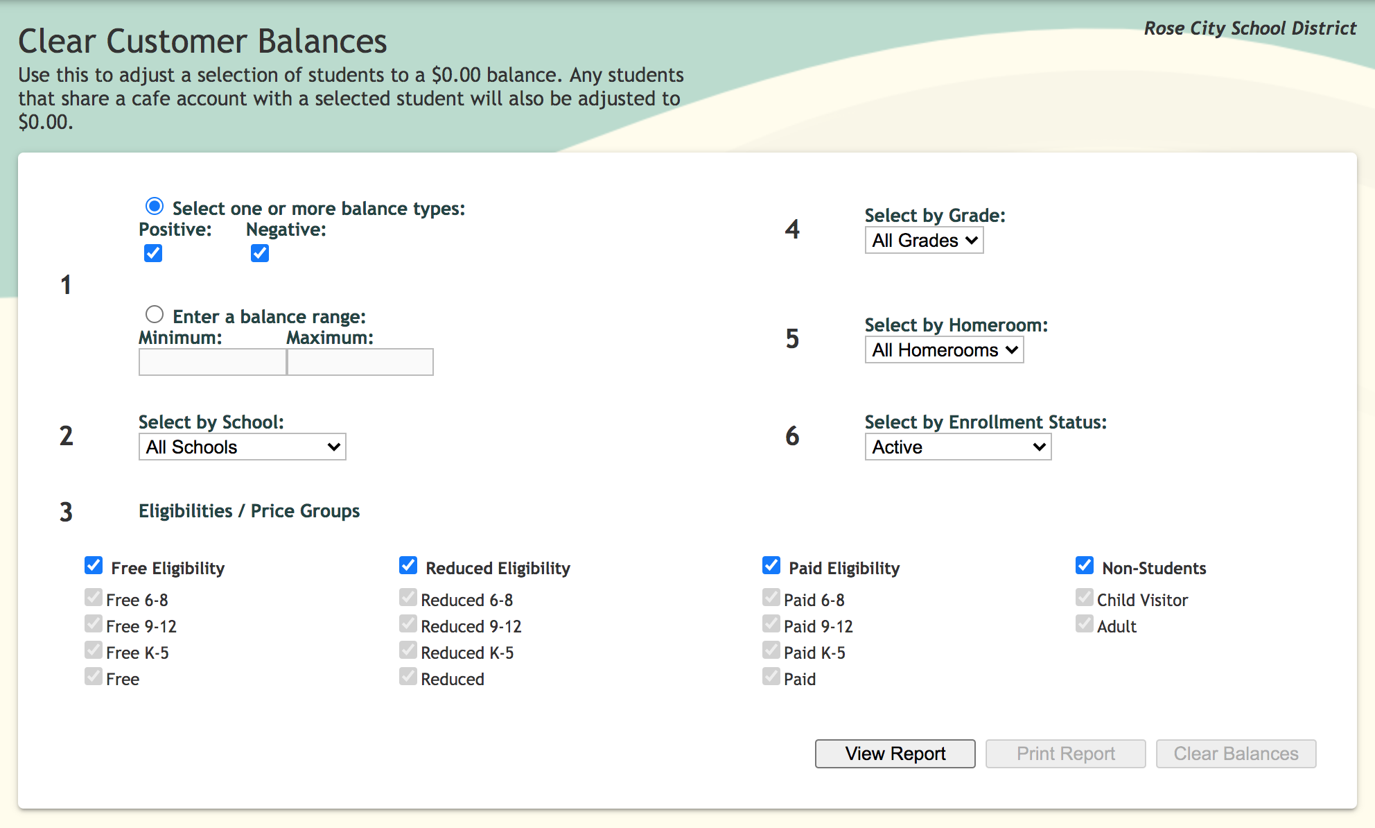 The Clear Customer Balances page provides the ability to adjust the account balance of a group of customer accounts to $0.00.
