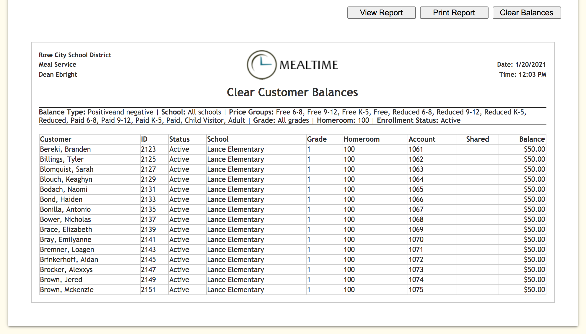 7. Click View Report to generate a list of students and their current account balances based on your selection criteria: