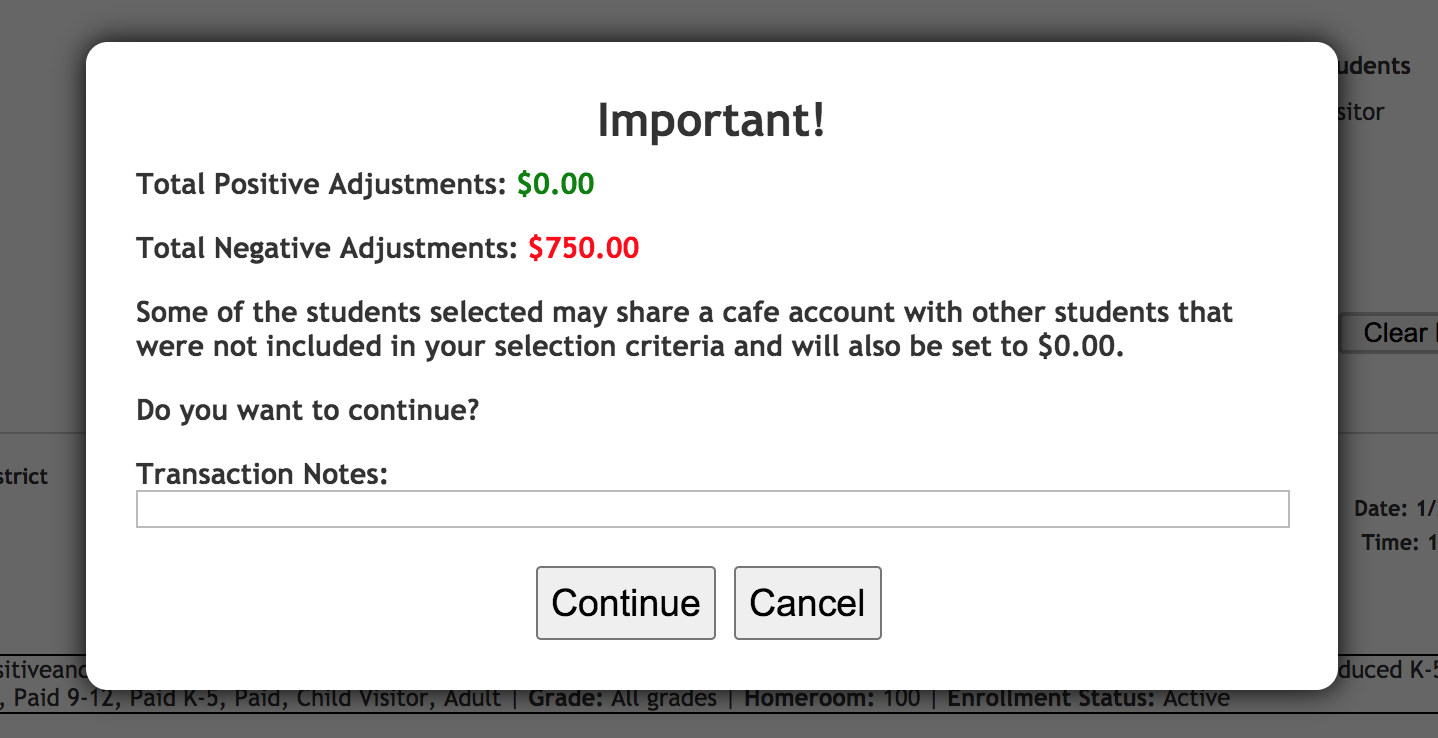 The Clear Balances window displays the Total Amount of Positive and/or Negative adjustments that will be processed as well as informing you if selected students share a Cafe account. Students sharing a Cafe account with a student on the Clear Balance list will also have their balance zero'd out: